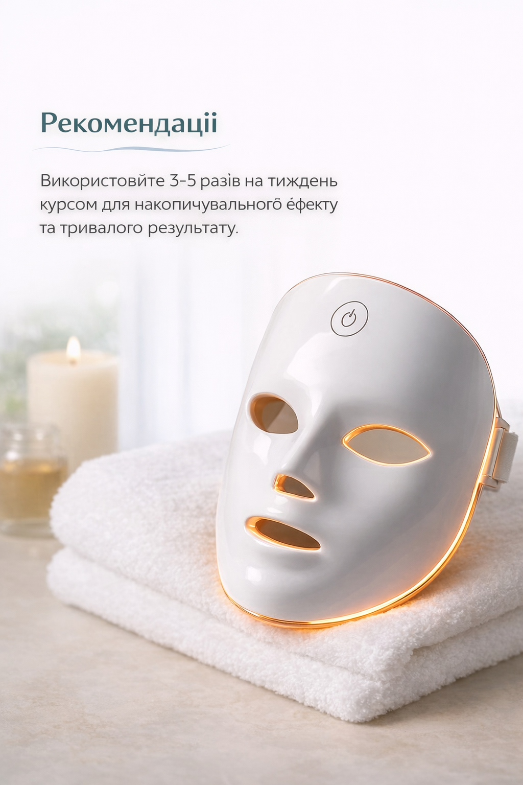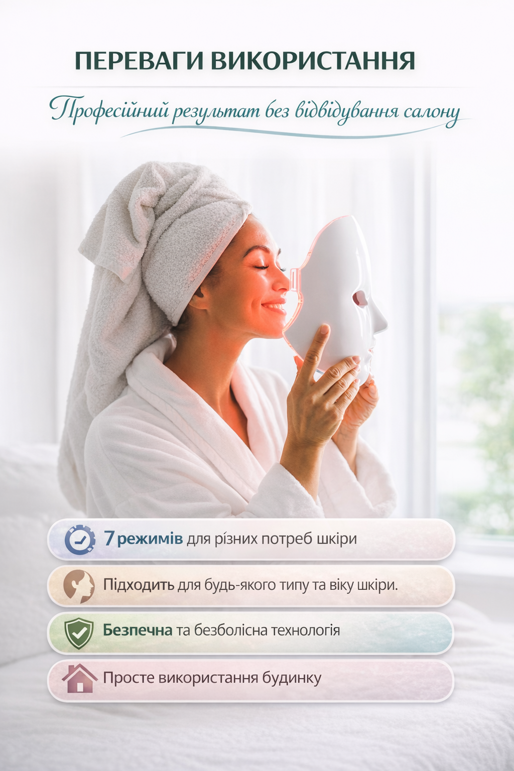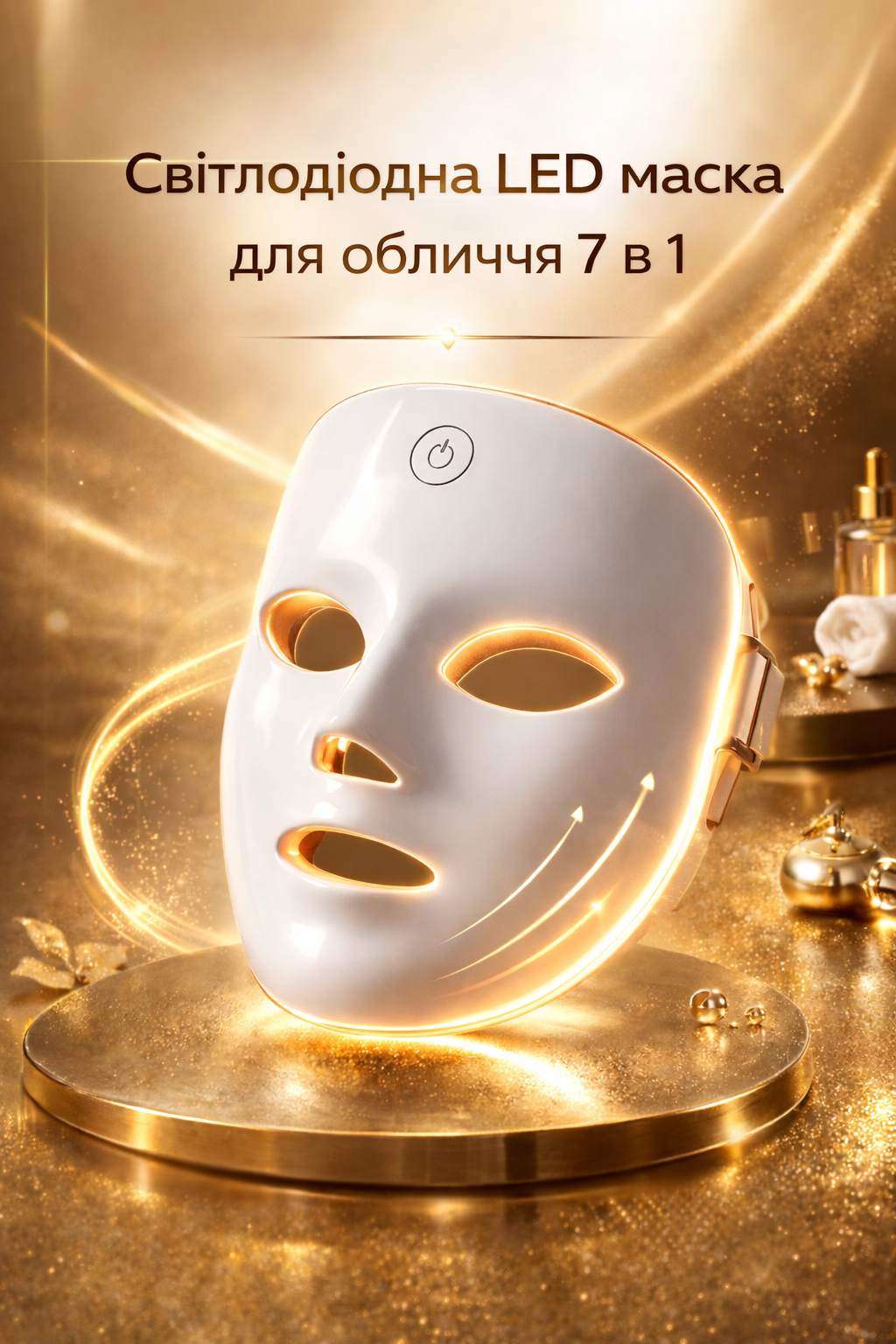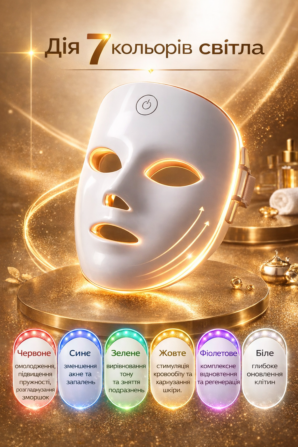 LED-маска 7 в 1 – це сучасний б'юті-гаджет, який поєднує технології світлотерапії та комфорт домашнього догляду. Використання різних спектрів світла дозволяє працювати з основними проблемами шкіри: від втрати пружності та зморшок до запалень та пігментації.