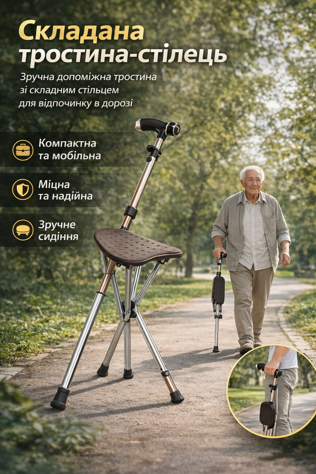 Складана тростина-стілець поєднує функції опори та зручного сидіння. Легко складається, не займає багато місця та зручно переноситься під час прогулянок або подорожей.